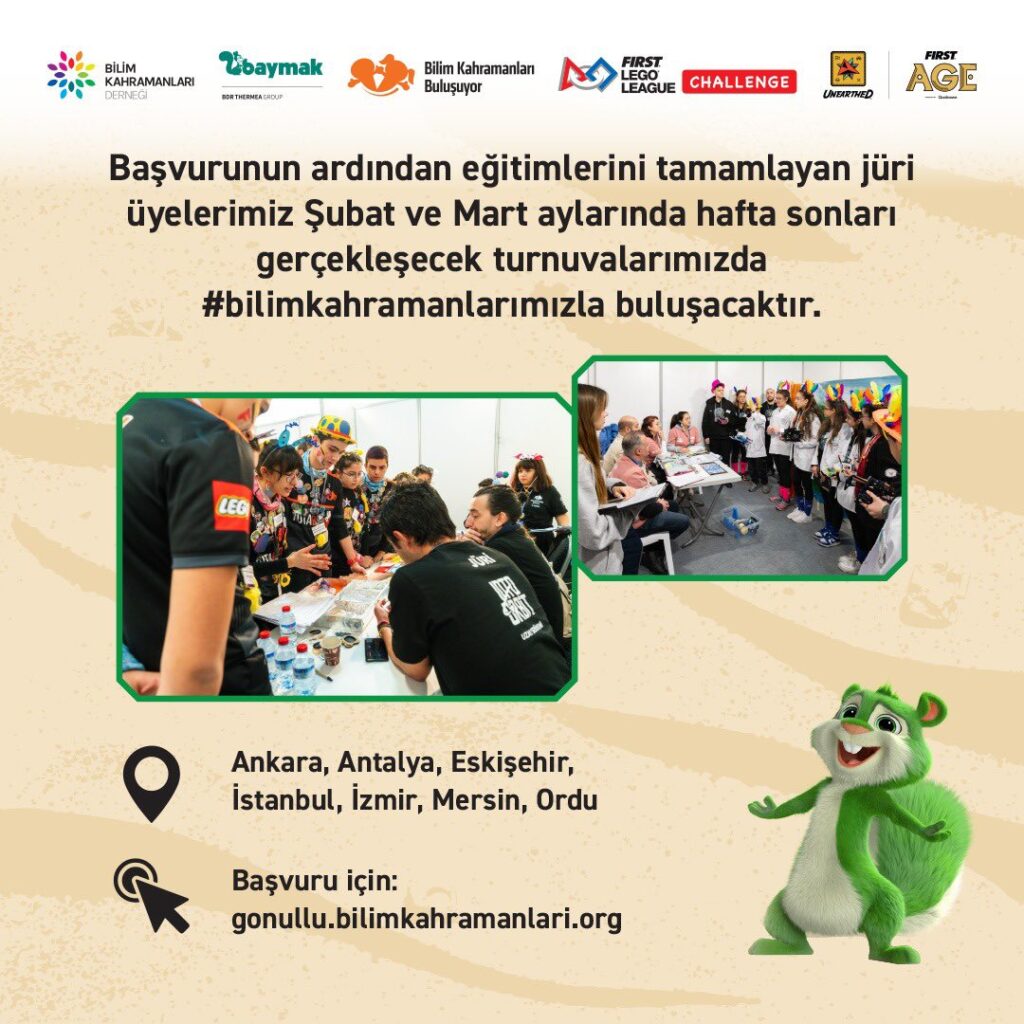 Bilim Kahramanları Derneği, Bilim Kahramanları Buluşuyor / FIRST® LEGO® League Challenge UNEARTHED™ sezonunda çocuk ve gençlerin bilimsel araştırma yolculuklarına eşlik edecek gönüllü jüri üyeleri arıyor. Bu yıl 22. sezonu gerçekleşecek Bilim Kahramanları Buluşuyor / FIRST® LEGO® League Challenge Türkiye Turnuvalarında, öğrencilerin yenilikçi projeleri, robot tasarımları ve takım çalışması süreçleri jüri üyeleri tarafından değerlendirilecek. Jüri Üyelerinin