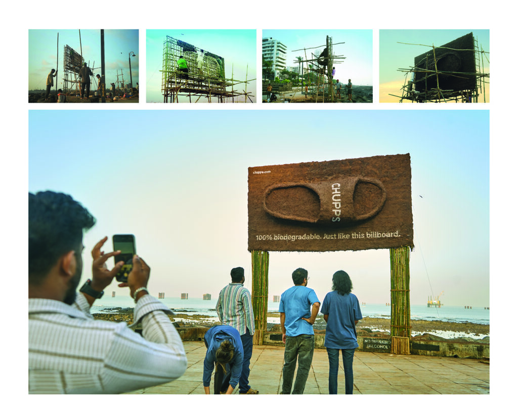 Hindistan merkezli ekolojik ayakkabı markası Chupps Footwear, ürünlerinin doğada çözünebilirliğine dikkat çekmek amacıyla yağmurla birlikte yok olan bir pano hazırladı. Bu kampanya ile sürdürülebilirlik kavramı soyut bir söylem olmaktan çıkıp dokunulabilir gerçek bir deneyime dönüştü. Çamur, saman, bambu, inek gübresi ve kil karışımıyla tamamen doğal malzemelerden yapılan pano, yağmur yağdığında yavaş yavaş çözülüyor ve sağlam