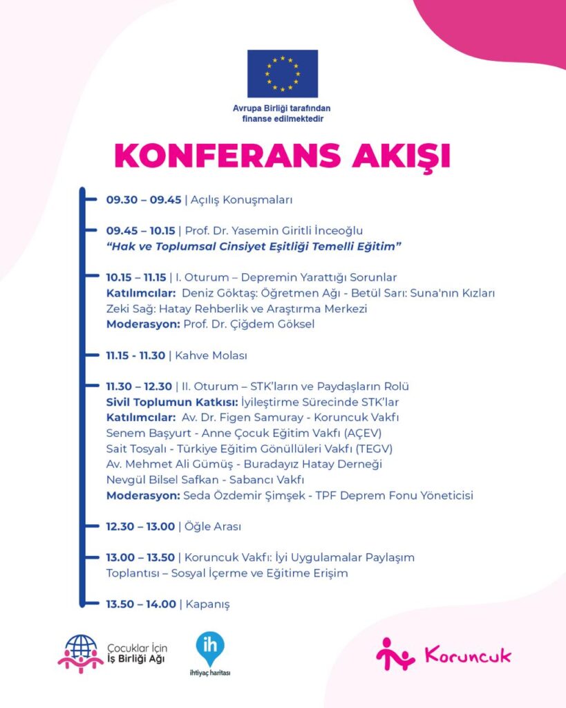 Konferans eğitime erişimde karşılaşılan engelleri, mevcut ihtiyaçları ve çözüm önerilerini sivil toplum, akademi ve özel sektör temsilcilerinin katkılarıyla ele alacak. Ayrıca kriz dönemlerinde çocuk haklarının nasıl korunabileceğine, kurumlar arası iş birliklerinin geliştirilmesine ve yürütülen çalışmaların etkisine yönelik değerlendirmeler için bir tartışma ve paylaşım ortamı sunacak.