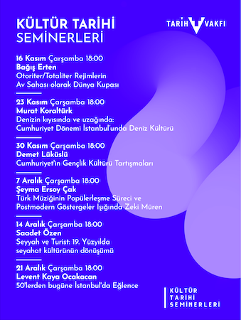 Kurulduğu 1991 yılından itibaren Türkiye’de tarihe olan ilginin gelişmesine hizmet eden Tarih Vakfı, Türkiye‘nin sosyal ve kültürel tarihine odaklanan yeni seminer serisi ile günümüz Türkiyesi‘nin kültürel hayatı ve imparatorluk mirasının rolünü inceliyor. Yaşar Tolga Cora’nın koordinatörlüğünde 16 Kasım 2022 tarihinde başlayacak seminerlerde birbirinden farklı konuların uzmanları tarafından ele alınacak. En az üç seminere katılanlar, seminer