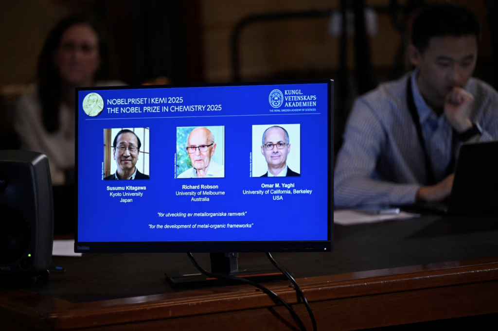 Bilim insanları Susumu Kitagawa, Richard Robson ve Omar Yaghi, moleküler düzeyde yeni bir yapı türü geliştirerek, iklim değişikliğiyle mücadele ve tatlı su eksikliği gibi küresel sorunların çözümüne katkı sağlayabilecek malzemeler yaratmaları nedeniyle 2025 Nobel Kimya Ödülü’ne layık görüldü.