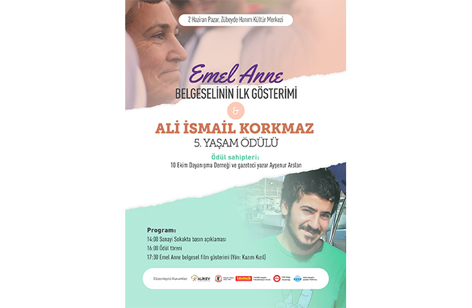 Ali İsmail Korkmaz Yaşam Ödülleri’nin beşincisi, 2 Haziran Pazar günü Eskişehir Zübeyde Hanım Kültür Merkezi’nde düzenlenen törenle sahiplerine verilecek. Bu yılki ödüller, gazeteci yazar Ayşenur Arslan ve 10 Ekim Dayanışma Derneği’ne takdim edilecek. Etkinlikte ayrıca “Emel Anne” belgeselinin ilk gösterimi gerçekleşecek.