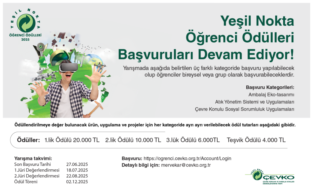 ÇEVKO Vakfı tarafından düzenlenen 2025 Yeşil Nokta Öğrenci Ödülleri için başvuru süreci, 10 Şubat 2025 tarihinde başladı. Yeşil Nokta Öğrenci Ödülleri, üniversite öğrencilerinin ambalaj tasarımı, atık yönetimi ve sosyal sorumluluk alanında özgün çevre dostu ürün, uygulama ve proje geliştirmelerinin teşvik edilmesini ve üniversite-sanayi iş birliğinin geliştirilmesini hedefliyor. Her kategoride ilk 3’e giren projeler ödüllendiriliyor. Başvuru süreci, 27 Haziran 2025 Cuma günü sona erecek.