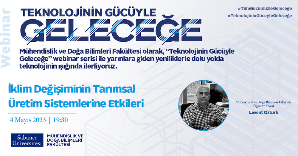 Sabancı Üniversitesi’nin düzenlediği “Teknolojinin Gücüyle Geleceğe” Webinar Serisi’nin 2023 programının ikinci semineri “İklim Değişiminin Tarımsal Üretim Sistemlerine Etkileri” teması ve Sabancı Üniversitesi Mühendislik ve Doğa Bilimleri Fakültesi Öğretim Üyesi Levent Öztürk’ün katılımıyla gerçekleşti.