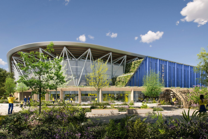 Tasarım görselleri, hafif eğimli çatısı, kıvrımlı mavi panellerle kaplı köşeleri ve tek katlı cam hacim üzerindeki yeşil çatısıyla modern ve çevre dostu bir mimari anlayışını yansıtıyor. Yeşil duvarlar ve peyzaj mimarlığı stüdyosu Fabrik tarafından tasarlanan dış alanlar, ağaçlar, göletler, arı kovanları ve yabani çiçeklerle yerel biyolojik çeşitliliği destekleyecek.
