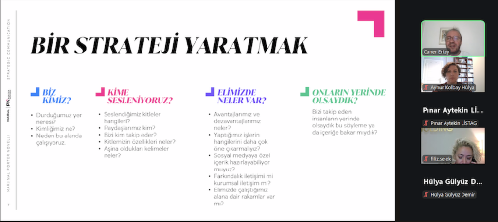40 farklı kurumdan 61 katılımcının yoğun ilgi gösterdiği etkileşimli soru-cevap oturumlarıyla desteklenen eğitimde, güncel internet ve sosyal medya kullanımı, etkili hikâye anlatımı, strateji geliştirme ve kriz yönetimi gibi konulara da değinildi. Ayrıca içerik üretiminde dikkat edilmesi gereken noktalar, çekim tekniklerine dair dokümanlar ve yönlendirici kaynaklar katılımcılarla paylaşıldı.