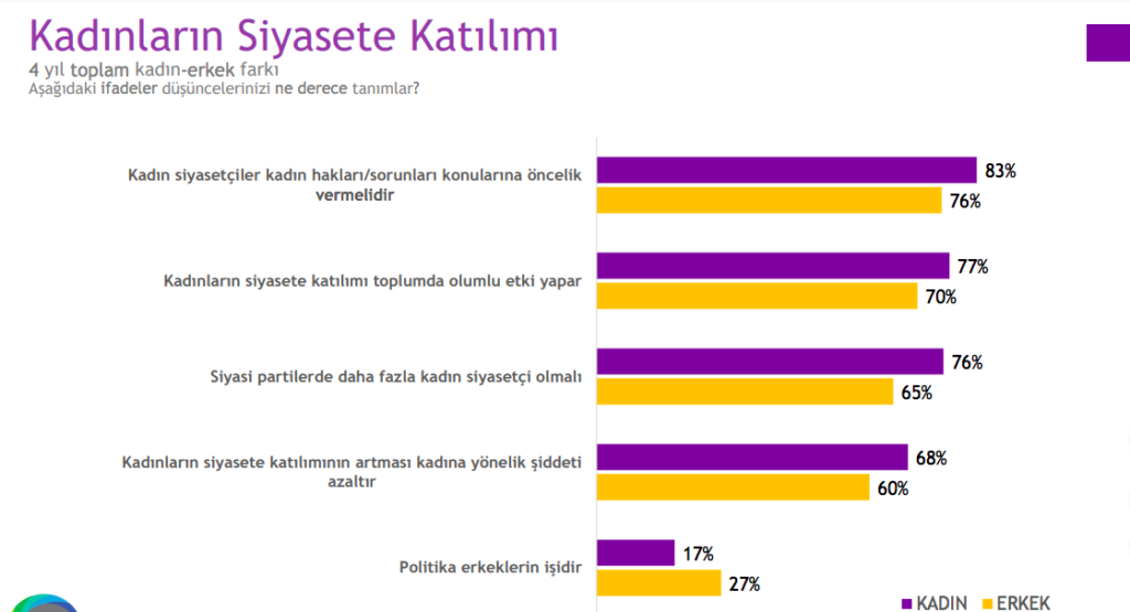 Katılımcılar, “Kadın siyasetçiler kadın hakları/sorunları konularına öncelik vermelidir” ifadesini değerlendirirken yüzde 81’i ‘Evet’ cevabını verdi. Geçtiğimiz yıllara göre kadınlar, siyasi liderlikte kadın adayları destekleyeceklerini artan bir oranla belirtirken, erkeklerin kadın siyasi lider adaylarına aynı sıcaklıkta yaklaşmadığı ortaya çıkıyor.